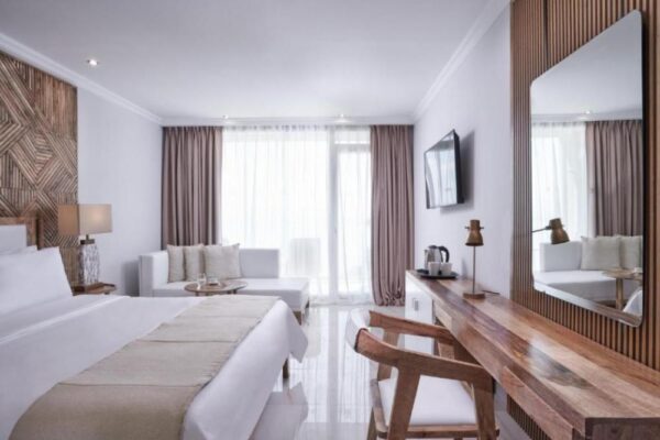 Het Mythos Palace biedt 276 kamers, variërend van standaardkamers met land- of zeezicht tot superiorkamers met een eigen plunge pool. Elke kamer is goed uitgerust met onder meer airconditioning, wifi, een minibar en koffie-/theefaciliteiten, en biedt een balkon of terras met zitje. Voor sport- en ontspanningsactiviteiten beschikt het hotel over faciliteiten zoals yoga, tennis, een fitnessruimte en zelfs een eigen duikcentrum. Er zijn twee buitenzwembaden met gratis ligbedden, parasols en badhanddoekenservice. Qua verzorgingsopties biedt het hotel verblijf op basis van logies en ontbijt, met mogelijkheden voor halfpension of all inclusive voor een meerprijs, inclusief maaltijden, snacks en een selectie van lokale drankjes. Extra luxe diensten, zoals roomservice, wasservice en een doktersservice, zijn beschikbaar tegen betaling, net als de mogelijkheid voor à la carte dineren in het exclusieve Ouranos rooftop restaurant. Dit wil je niet missen!